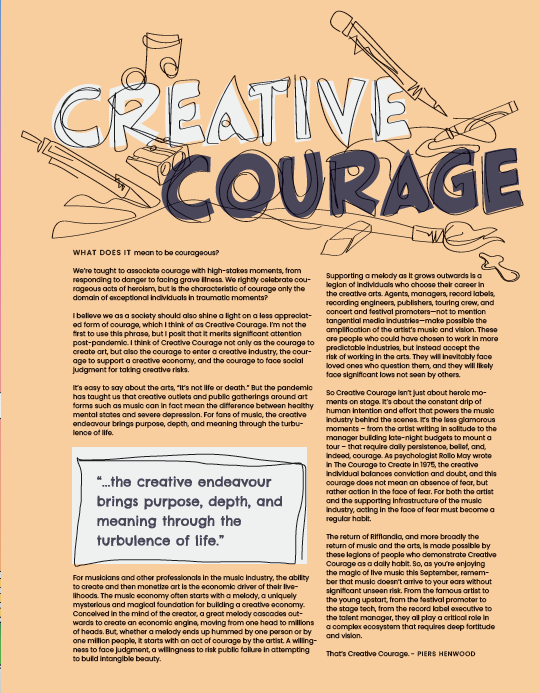 So Creative Courage isn’t just about heroic moments on stage. It’s about the constant drip of human intention and effort that powers the music industry behind the scenes. It’s the less glamorous moments – from the artist writing in solitude to the manager building late-night budgets to mount a tour – that require daily persistence, belief, and, indeed, courage. As psychologist Rollo May wrote in The Courage to Create in 1975, the creative individual balances conviction and doubt, and this courage does not mean an absence of fear, but rather action in the face of fear. For both the artist and the supporting infrastructure of the music industry, acting in the face of fear must become a regular habit.
